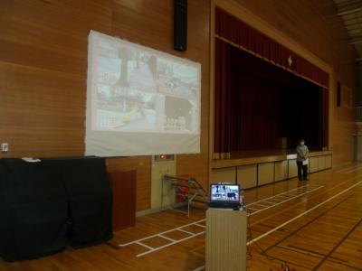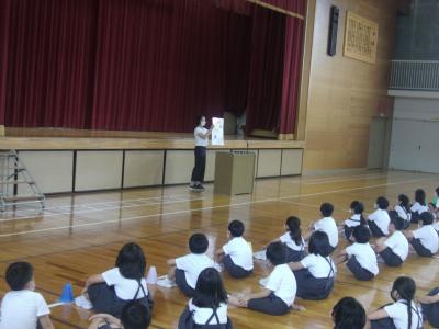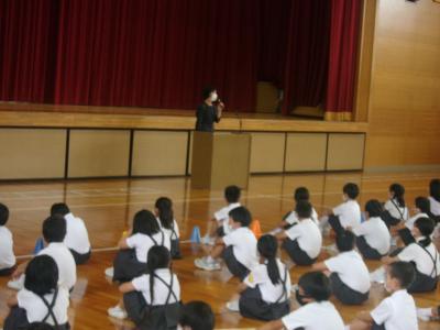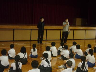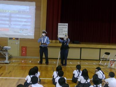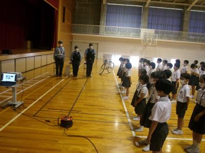 避難訓練の後は、体育館に集合し、生活安全刑事課生活安全係長様から登下校時に気を付ける事を映像を交えて指導して頂きました。大変わかりやすいお話で子どもたちも、登下校時の安全意識が高まったのではないかと思います。
