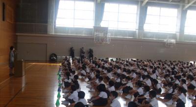 7月29日(水)の1限目に交通安全教室を実施しました。新型コロナウイルス感染防止の為、5月より延期になっていた教室です。規模を縮小して本日行うことができました。しかし、雨模様の為、3年生の自転車実技は中止となり体育館で輪島警察署交通課、朝市交番の皆様による講話と安全指導が行われました。3年生以外の学年は、警察からお借りした交通安全DVDを教室で視聴し、意見交換する等担任指導の下で交通安全について再確認をする予定です。3年生の聴く態度が大変立派でした!よく頑張りましたね3年生!素晴らしかったです。