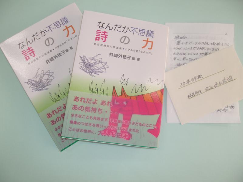 本校の詩の暗唱の記事が新聞に掲載されて以来、交流の輪が広がっています。本日、日本現代詩人会会員、日本ペンクラブ会員の井崎外枝子様から、お手紙と「なんだか不思議詩の力」の本を贈呈して頂きました。お手紙には本校の取り組みに対する心温まるお言葉が書かれていました。「なんだか不思議詩の力」は、朝日新聞石川版に掲載された子どもの詩の選詩集で、子どもたちの詩に先生のお言葉が添えられたとても素敵な本です。ぜひ、子どもたちに紹介して活かしていきたいと考えております。井崎先生、本当に貴重な本と素敵なお手紙をありがとうございました。