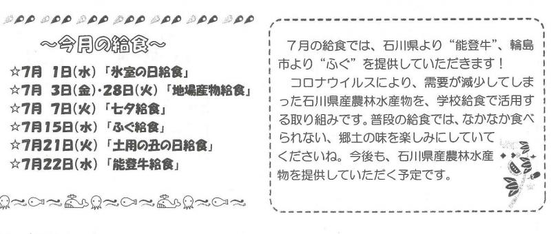 上の記事を見てわかるように、7月は、特別メニューが目白押しです。7/1氷室の日給食 7/3地場産物(トビウオフライ) 7/7七夕給食(七夕ゼリー) 7/15輪島ふぐ給食 7/21土用の丑の日給食 7/22 能登牛給食 7/28地場産物(いかのかりん揚げ)が献立に含まれます。輪島ふぐ・能登牛なんて、びっくりしますね。能登牛は、石川県より、輪島ふぐは輪島市より提供して頂いたそうです。暑い日が続きますが、給食を楽しみにして1日1日を頑張ってほしいです。