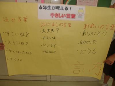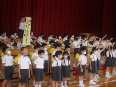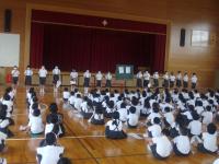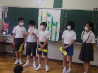 各委員会のお知らせでは、今月の目標や皆さんへのお知らせが伝えられました。6年生からのお知らせでは、今月の生活目標や生活・学習の約束について、劇を取り入れた内容で、大変わかりやすいものでした。また、代表委員会からは、新型コロナウィルスに感染した人に対して、差別をしないことなどをわかりやすく説明していました。どのお知らせも、6年生が中心となり、しっかりはっきりと伝えていました。ここでも、6年生の輝きが見えています。