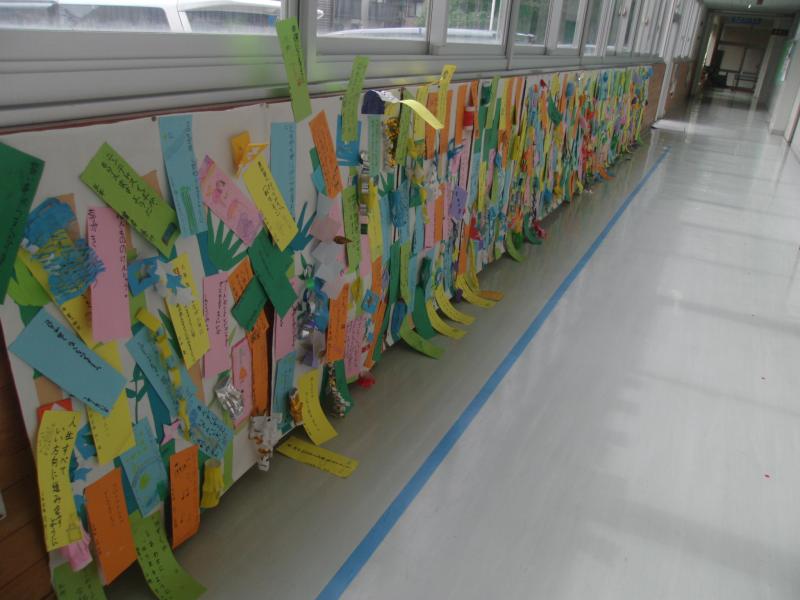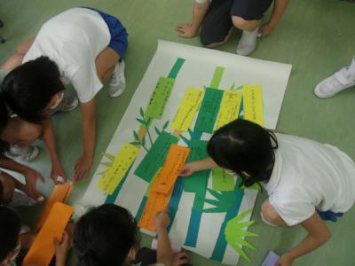 7月3日(金)のお昼に、たてわり仲良し会を行いました。今日は、七夕の飾り付けです。それぞれの児童が短冊に願いを書いて持ち寄りました。6年生のリーダーが中心となり会がスタートしました。初めに、6年生がきちんとわかりやすく説明を行った後、それぞれの願い事を発表し合いました。発表し終わったら温かい拍手がおこるなど、とても素敵な雰囲気の中で会は進んでいきました。そして最後に願い事を書いた短冊を張り付け、記念写真を撮って完成です。とっても楽しい、たてわり仲良し会でした。