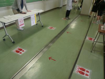 河井小学校では、ご家庭で検温し記入された健康観察票を児童玄関で集めています。人数が多いため、密ならないために、児童が距離感を保てるように、複数のテーブルを配置する等、写真のような工夫をしています。