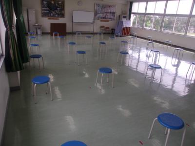 音楽室は、防音効果も高い=密閉空間になります。思い切って集会室「風」を音楽室にしました。前後左右かなり離れています。