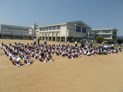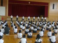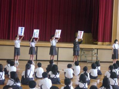 6月3日(水)5限目に全校集会が開かれました。3密にならないように、間隔、換気、短時間を目標に行いました。集会では、各委員会より活動目標などについての報告がありました。次に代表委員会から今月の目標について、実例を挙げながら大変わかりやすい話がありました。委員会の報告も代表委員会からのお知らせも大変ビシッとした態度で素晴らしいものでした。