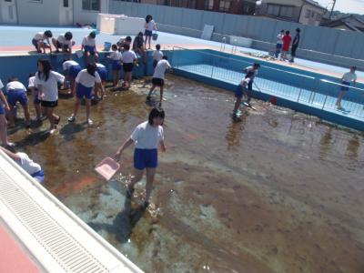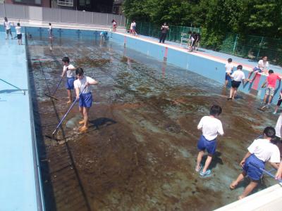 6月9日(火)に5・6年生がプール掃除を行いました。5年生は、プール周辺部の掃除、6年生は、プール内の掃除を行いました。プール内は、枯れ葉や土・泥など汚れていましたが、6年生がスポンジ・水切りワイパーなどを使って丁寧に掃除をしてくれたおかげでとてもきれいになりました。5年生・6年生ありがとうございました。これできれいなプールに入れますね。