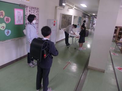 登校した児童は、児童玄関において健康観察票の回収と健康観察、アルコール消毒を行ってからの入校です。子どもたちもきちんと提出していました。保護者の皆様のご協力のおかげで、マスク着用率も大変高くなっております。手作りマスクでもOKなので、感染防止にご協力下さい。