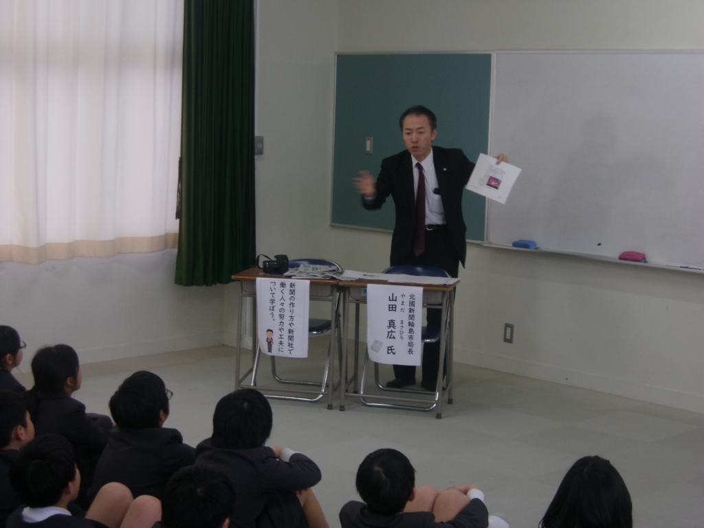 2月6日(木)5限に、ゲストティーチャーの5年生特別授業が行われました。授業をして頂いたゲストティーチャーは、北國新聞社輪島総局長の山田真広さんです。テーマは、ズバリ「新聞」。5年生は、社会科の授業で新聞について学習を行っており、そのまとめとしてゲストティーチャー授業をお願いしました。