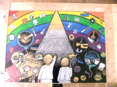 3月3日(火)6年生が1月から取り組んでいた卒業制作が完成しました。今日は、取材記者も来校しての完成披露となりました。今年の作品タイトルは、「思い出の雨から虹へ」です。