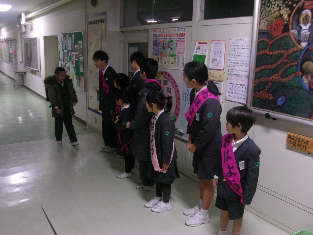 今週火曜日から、河井小学校では、学年をミックスしてのあいさつ運動が始まりました。毎朝元気な声が、児童玄関に響いています。今週は、1年生と6年生が担当しました。仲良くあいさつする姿は、とても微笑ましいものです。来週火曜日からは、2年生と5年生が担当しますます。