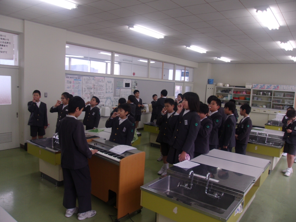 今回の体験は、輪島市の茶道部会の旭岡先生をはじめ8名の先生方のご協力によるものです。河井小学校には、畳の部屋がありませんので、集会室「光」にゴザをしき、床の間を設置してお茶室の空間をつくりました。茶道体験といえども、作法は本格的なもので、裏千家流盆略点前で行いました。美味しい和菓子を頂き、作法にのっとりお抹茶を頂きます。子どもたちは、「ちょっぴり苦いけど、美味しい」という感想を話していました。中には、お代わりをお願いする児童もおり、大変有意義な体験教室となりました。