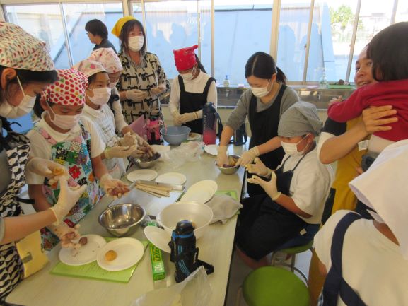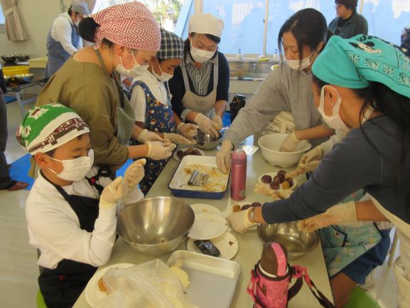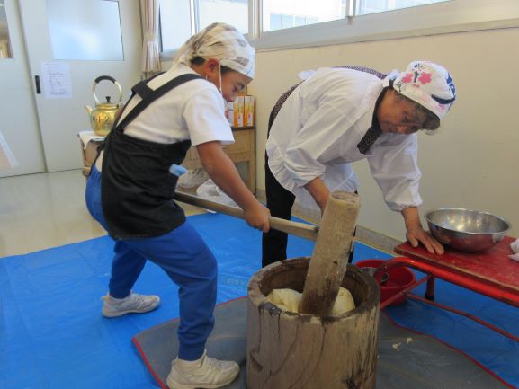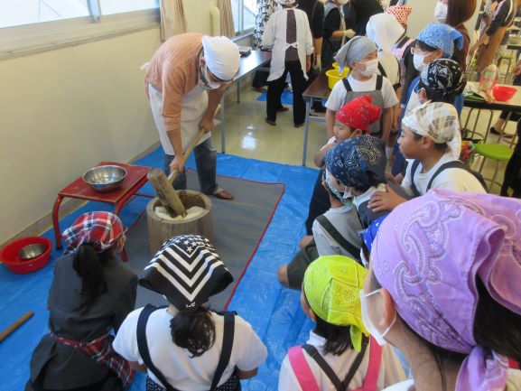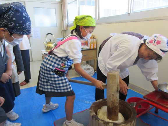 2019年11月8日 18時28分 11月8日(金)5・6限目に、4年生親子活動(親子餅つき収穫祭)が開かれました。農業体験の締めくくりとして行う恒例の親子行事です。この体験活動は、本格的な餅つきで、杵と臼(2セット)を使い餅をつきます。4年生の児童は、保護者の方の餅をつく姿を参考にして、全員が挑戦していました。つきあがった餅は、きれいにまとめられ、あんこときな粉をまぶし、美味しいお餅に仕上がりました。子どもたちと保護者の皆様が、顔を突き合わせてつくる姿は、大変微笑ましく、とてもいい体験となりました。