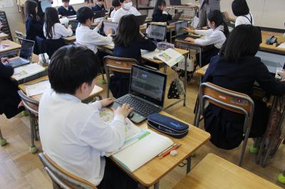 も達・・授業が始まると、クロムブックで心の数直線を見せ合いながら、「思いやり」についての子ども同士のたくさ