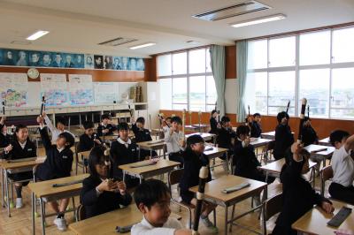 そして、いよいよリコーダーをふきました。正しい持ち方やふき方も教えていただいて、全員で一斉に「シ」の音をふきました。最初はなかなか音がそろわなかったけど、何回かするうちに、始まりも終わりもそろうようになってきました。
