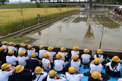 御田植式では、5年生4人の早乙女が「御田植の儀」で田植えをし、5年生みんなで見学をしました。