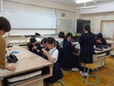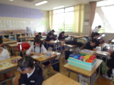 5年生は4月から家庭科で手縫いの学習をしています。「玉結び」「玉止め」「ボタン付け」「なみ縫い」
