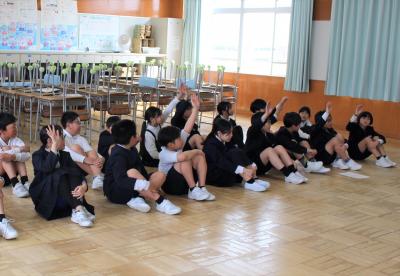 1年生から5年生が椅子をもって体育館に集合しました。