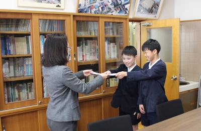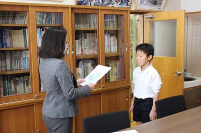 校長室で一人一人に賞状を渡しました。