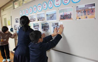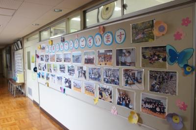 職員室前の掲示板には、卒業生の6年間の思い出の写真を掲示しています。