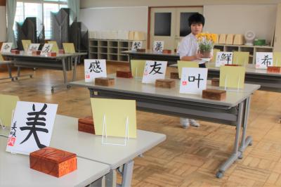 卒業に向けて毛筆で書いた一文字や、卒業制作のオルゴールを飾ります。