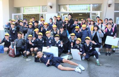 在校生に見送られて玄関まで来たあと、6年生全員で写真をとりました。