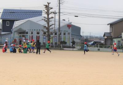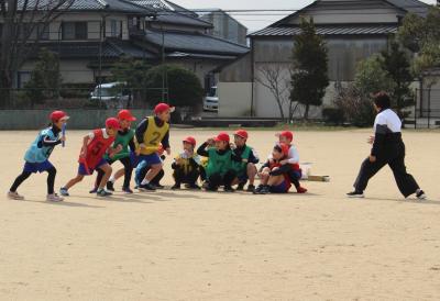 2年生は、運動場でリレーを行っていました。