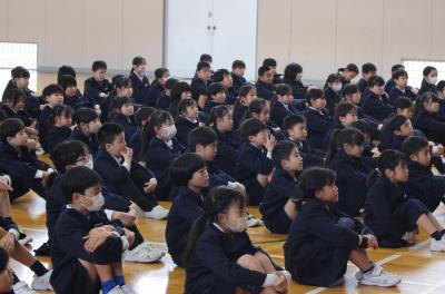 始業式では、川北小学校を「みんなが幸せな学校」にするために、