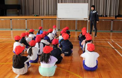 準備運動が終わったら、黒板の前に集まり、先生の話を聞きます。