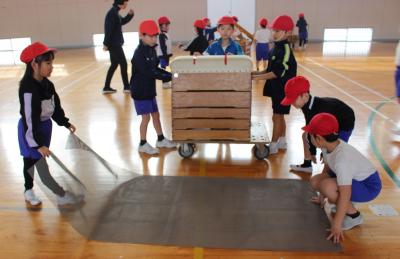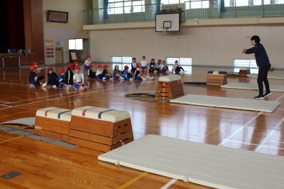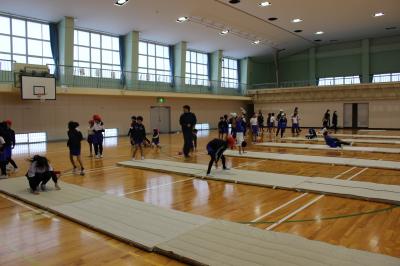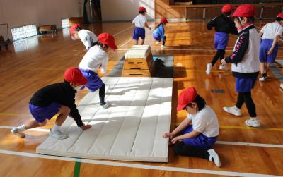 4年生は、体育でマット運動をしました。最初は、短いマットでいろいろな技を練習しました。次に、長いマットを使って、いろいろな技を組み合わせて行う連続技にチャレンジしました。最初なかなかうまくできなかった技も、練習を重ねていくと、きれいにできるようになりました。