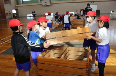 この児童は、体育館後ろに設置されている「間仕切り用の壁」について、注目しました。