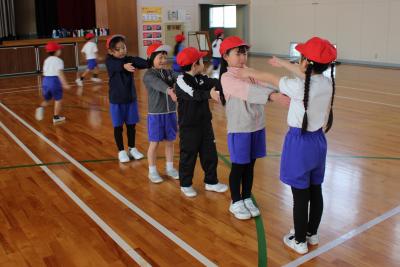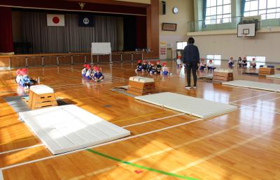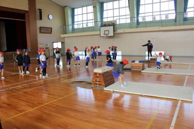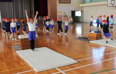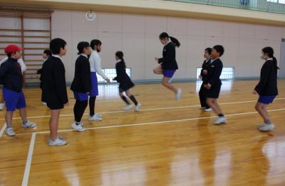 準備体操が終わったら、次は、先生の動きに合わせて、縦と横のジャンプ!
