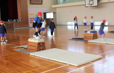 踏台で両足でしっかりジャンプして、跳び箱に乗るのが、コツです。