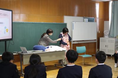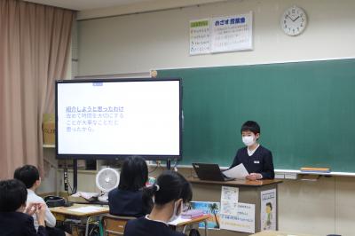 5年生は、学活で「命を大切に」の学習をしました。助産師においでいただき、生まれる時のことや赤ちゃんのことを学習しました。助産師さんのお仕事についてのお話を聞いたり、赤ちゃんの人形をだっこしたりして、命の大切さを学ぶことができました。お家の方々にも順番に赤ちゃんの人形をだっこしてもらいましたが、ご自分のお子さんが赤ちゃんだったころを思い出して、自然と笑顔になっていました。