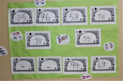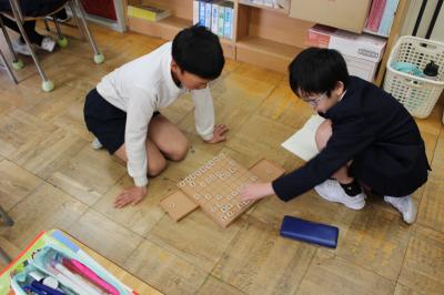 まず、4年生です。4年生では、算数科で「変わり方」の学習をしています。机のまわりに座る人数が、机が増えていくとどう変わっていくかを考える問題をしました。自分で考えた後、いろいろな人と交流して、変わり方のきまりを見つけていました。表を縦に見たり、横に見たりしながら一生懸命考えていました。