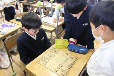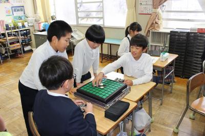 今日から2月になり、雪で外で遊べない日が続くことから、児童会からの提案で、2月からは冬の遊びをしてもいいことになりました。してもいい冬の遊びは、オセロや将棋などです。冬の遊びをしたい子は、職員室にオセロや将棋セットをとりに来て、教室で行います。