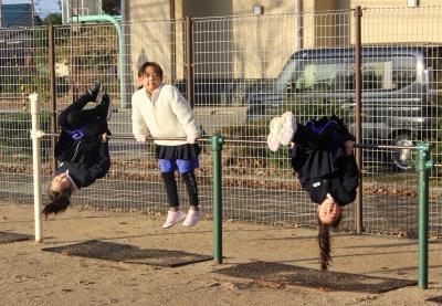 鉄棒で、前まわりをしています。