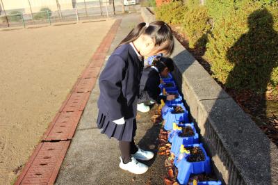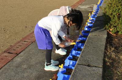 運動場に並べてある、植木鉢の様子を見に来た1年生。