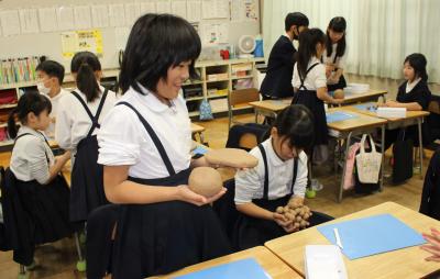 できあがったら、実際に手で持ち、重さを比べています。