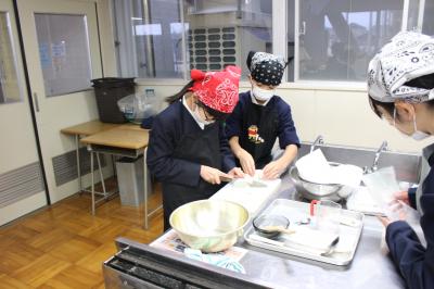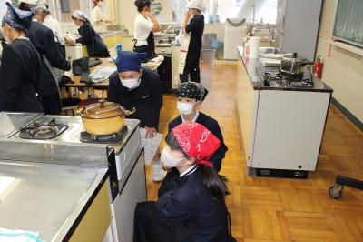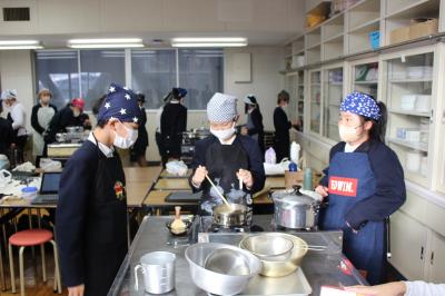 本校の家庭室が工事中のため、川北中学校の調理室をお借りして行いました。