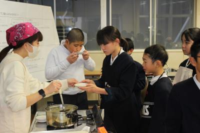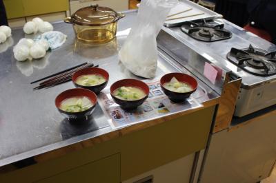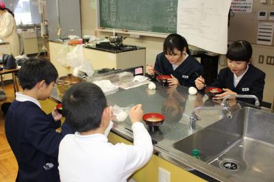 いよいよ、試食の時間となりました。みんな自分で作ったごはんとおみそ汁の味は格別のようでした。担任の先生が出汁の入っていないみそ汁も作っていて、味比べもしました。出汁がないと味が薄い感じがしたようで、出汁の必要性を感じていました。