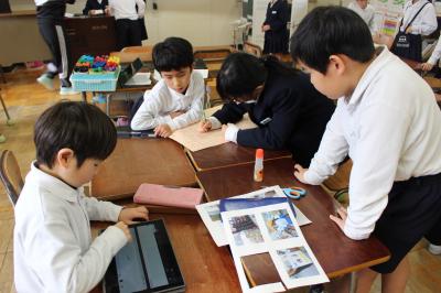 町探検のグループで、どのような発表にするか考え、スライドを作成しました。