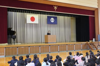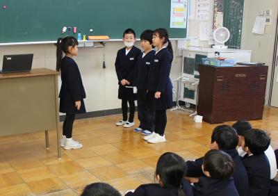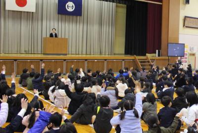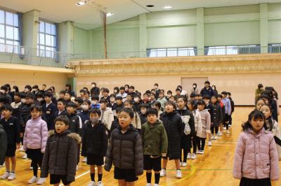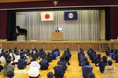最初に、校長先生のお話がありました。3学期はまとめの学期なので、1年間の総まとめを行って、次の学年につなげてほしいとお話されました。また、今年は巳年なので、蛇が脱皮して成長するようにみんなも大きく成長してほしいというお話もされました。