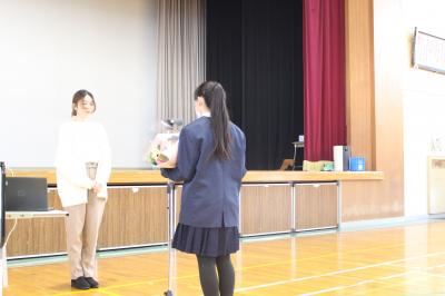 最初に、今日でお別れとなる司書の先生とのお別れの会をしました。司書の先生からみんなへのお別れの言葉を伝えてくださいました。その後、6年生の代表児童が感謝の言葉を伝え、花束を渡しました。
