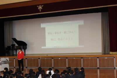 さらに、保健主事の先生から、冬休み中の過ごし方で大切なこととして、「早寝・早起き・朝ごはん」特に「睡眠」を大切にしましょうというお話がありました。