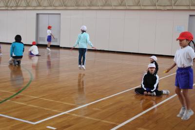 今日の1年生の体育では、縄跳びをしていました。中には半袖半ズボンの子もいましたが。決められた時間に何回跳べたか、友達同士数え合っていました。上手に跳んでいました。
