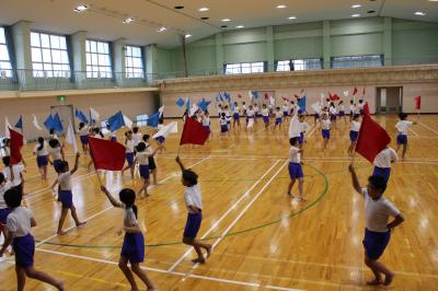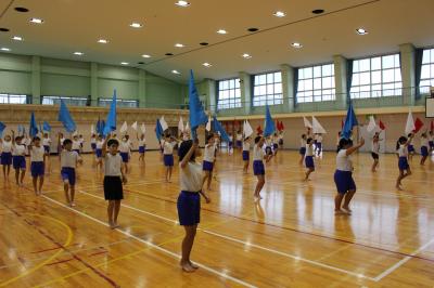 5・6年生の今年の表現は「合 ~心と体を一つに~」です。フラッグを使った表現と組体操を行います。