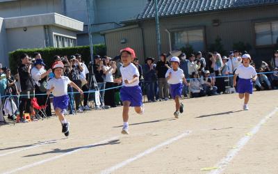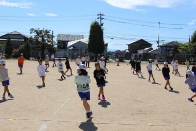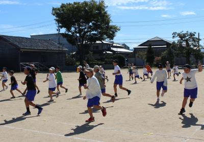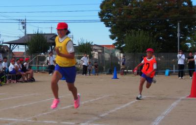 準備体操のあとは、1,2年生の個走は80m「ゴールをめざして、ゴーゴー!」
