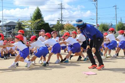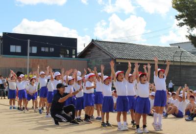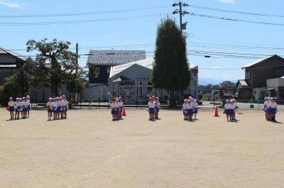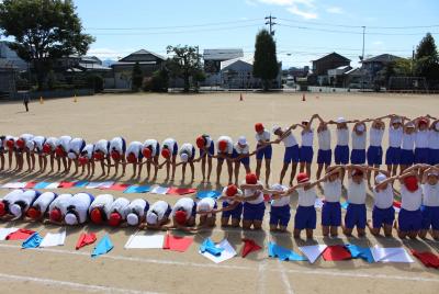 次に、組体操の練習をしました。しばらくフラッグの練習を続けていたので、組体操の動き出すタイミングを忘れてしまっている子もいましたが、こちらも練習するうちにそろってきました。