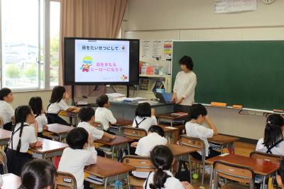 まず、養護教諭の先生から目を大切にするお話をしました。