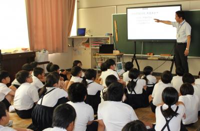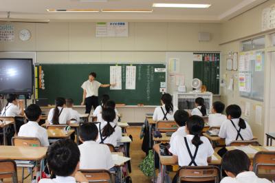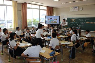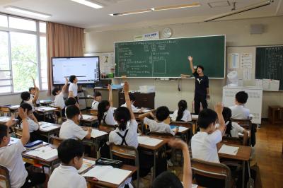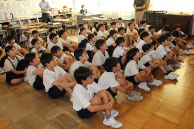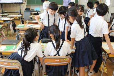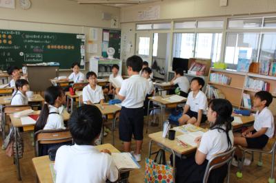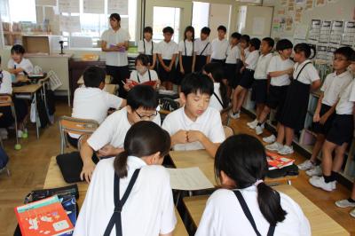 4年生は教室に戻り、5年生の授業の様子を見て思ったことなどの感想を書き出し、交流しました。感想の中には「先生の話を真剣に聞いていてすごいと思った」「すばやくグループで話し合いができていた」「自分たちも5年生のようになりたい」などいろいろな感想を書いていました。5年生から学んだことを、自分たちの授業でも実行していってもらいたいです。